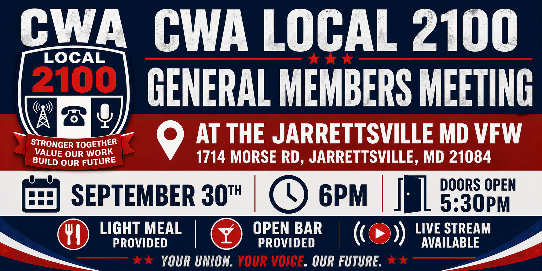 CWA Local 2100 will hold its General Members Meeting on September 30th at the Jarrettsville VFW, located at 1714 Morse Rd, Jarrettsville, MD 21084. Doors will open at 5:30 PM, with the meeting beginning promptly at 6:00 PM, and a live stream option will be available for those unable to attend in person. A light meal and open bar will be provided, giving members a chance to connect and engage before and during the meeting. In addition to important union updates and discussions, there will also be a drawing for prizes, so make sure to attend or log in for your chance to win.